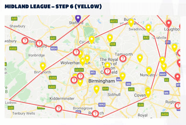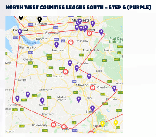 The FA have found the Step 6 mapping simulation extremely challenging because they are unaware as to what clubs currently are going to be promoted from Step 7 because of the application process and the need to comply with Ground Grading requirements (other than floodlights) having to be met before 31st March 2020, and floodlights erected by 30th September 2020. These clubs shown on the maps have a question mark withing a circle.